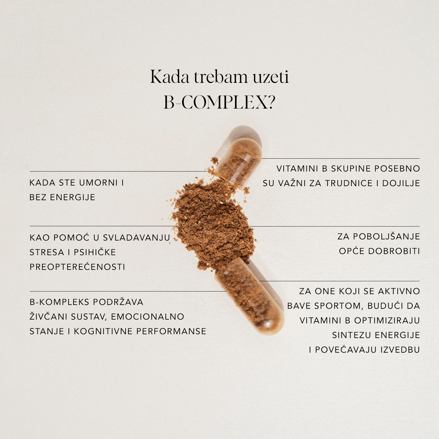 Ako želite povećati budnost i koncentraciju bez neželjenih učinaka kofeina, kao što su osjećaj anksioznosti i drhtanje ruku, naš B-Complex možete uzeti ujutro zajedno s kavom. Rodijola i adaptogeni u proizvodu, u kombinaciji s kofeinom, osigurat će smirenost i poboljšanu koncentraciju.